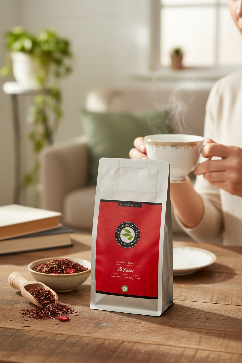 Beschreibung: Verführerische Mischung aus Rooibos- und Honeybush-Tee, kombiniert mit sanften Erdbeer- und Himbeernoten, abgerundet durch einen köstlichen Vanille-Sahne-Geschmack. Je t‘aime wird hre Sinne wecken und Ihr Herz zum Schmelzen bringen! Alles was Sie brauchen ist Liebe!