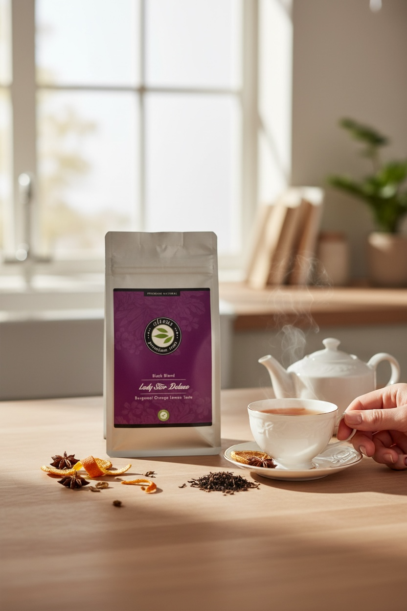 Beschreibung: Lady Star Deluxe begeistert mit einem lebendigen, fruchtig-frischen Geschmack. Die kräftige Schwarzteemischung verbindet würzige Tiefe mit feinen Orangen-Zitrus-Noten und einer leichten, blumigen Nuance.